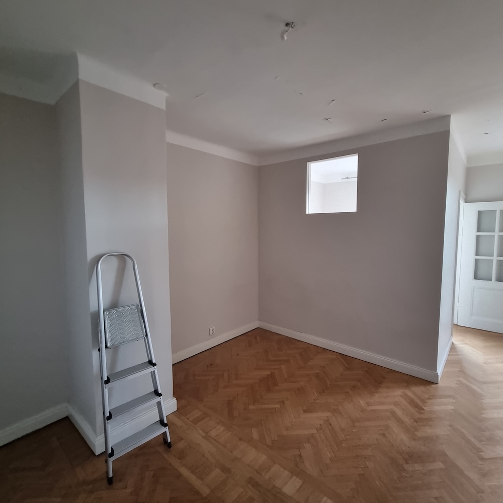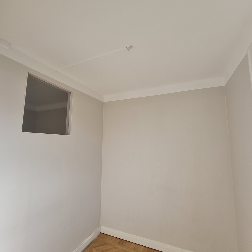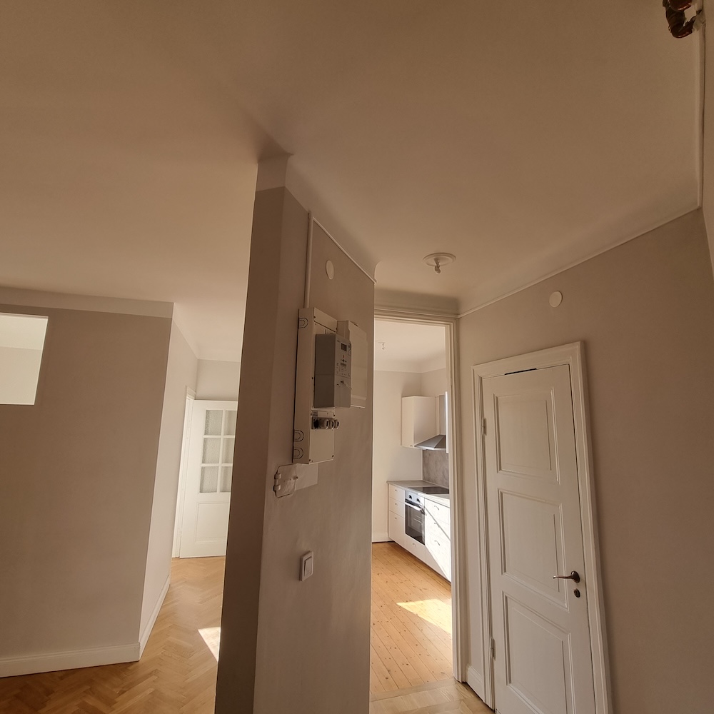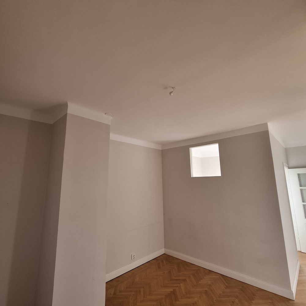 Efter spacklingen målade vi taket och delar av väggarna, vilket gav rummet ett fräscht och jämnt utseende igen. Ett noggrant och tekniskt arbete där rätt underarbete gjorde hela skillnaden för slutresultatet.
