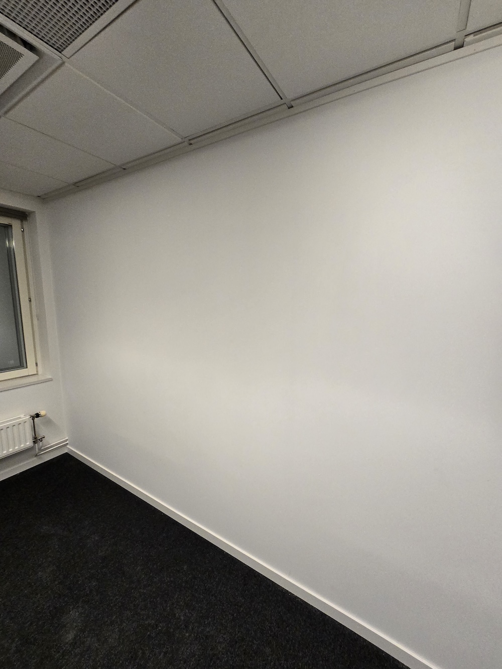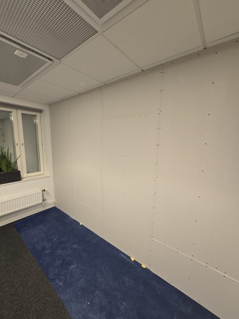 I det här projektet fick vi uppdraget att förbättra ljudisoleringen i flera mötesrum hos Ubiquiti där ljud läckte mellan rummen. För att lösa problemet förstärkte vi väggarna med ett extra lager gips, vilket effektivt minskade ljudöverföringen. Efter montering spacklades och målades alla ytor för att återställa ett jämnt och professionellt utseende.