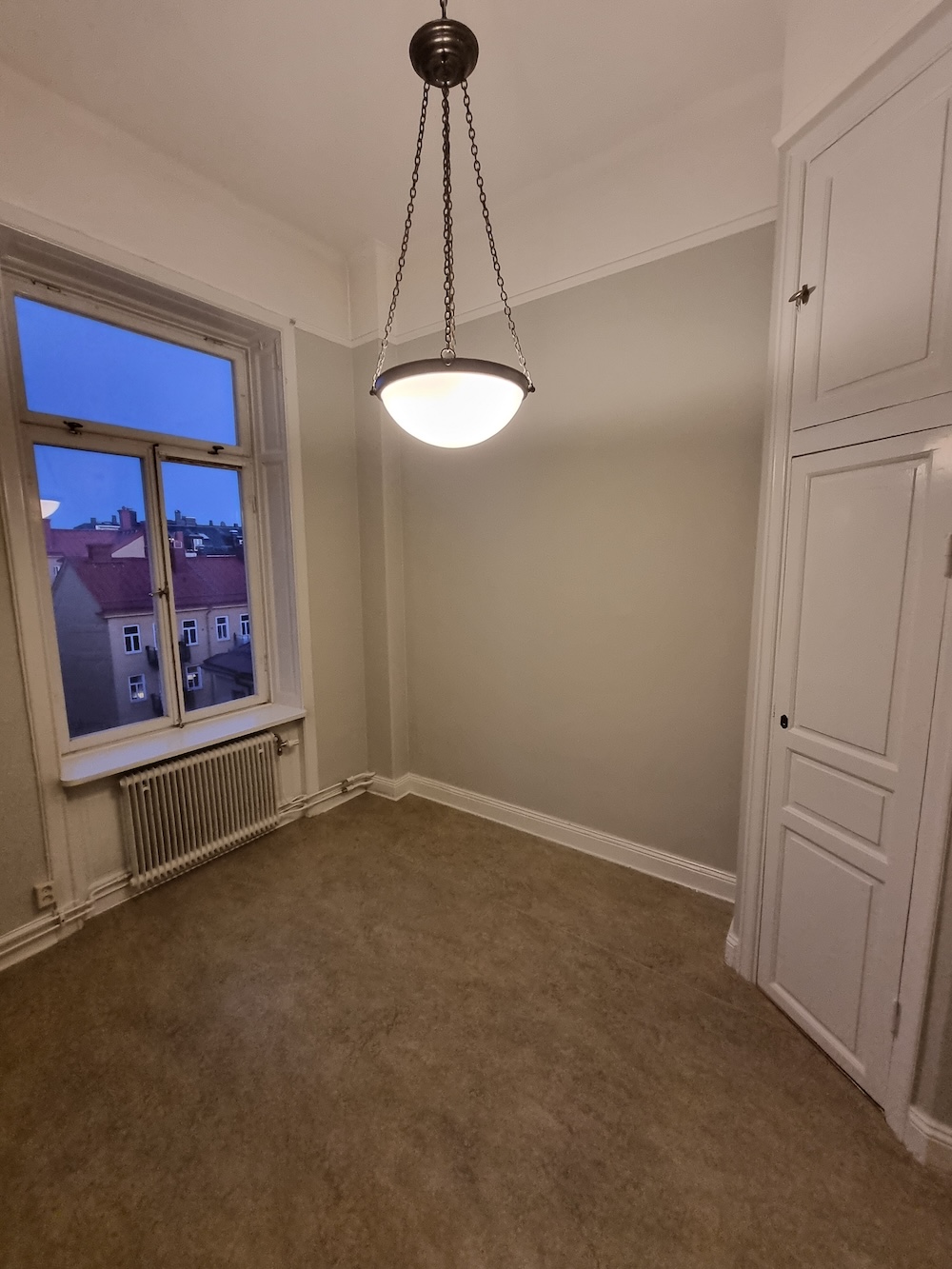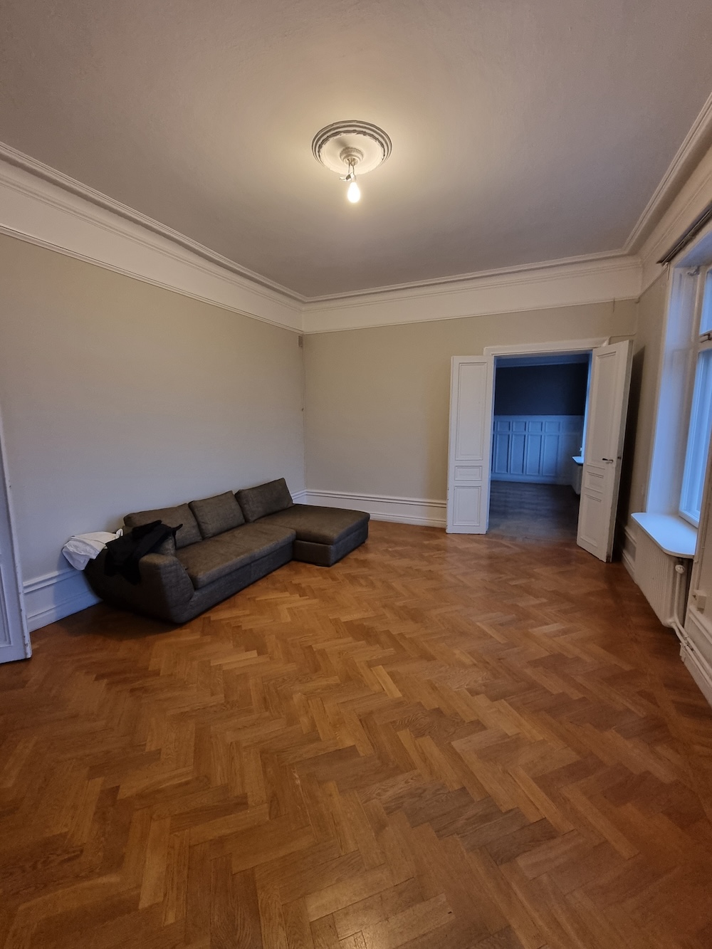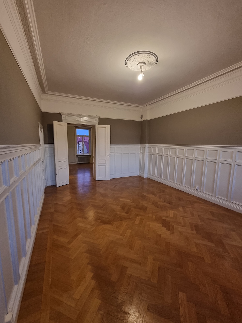 Vi målade alla väggar i harmoniska kulörer som framhävde bostadens ljus och karaktär, och genomförde samtidigt en köksrenovering för att skapa en sammanhängande helhetskänsla. Som en del av arbetet öppnade vi upp en vägg för att skapa en ny dörröppning – en förändring som gav bättre flöde och rymd genom den stora lägenheten.