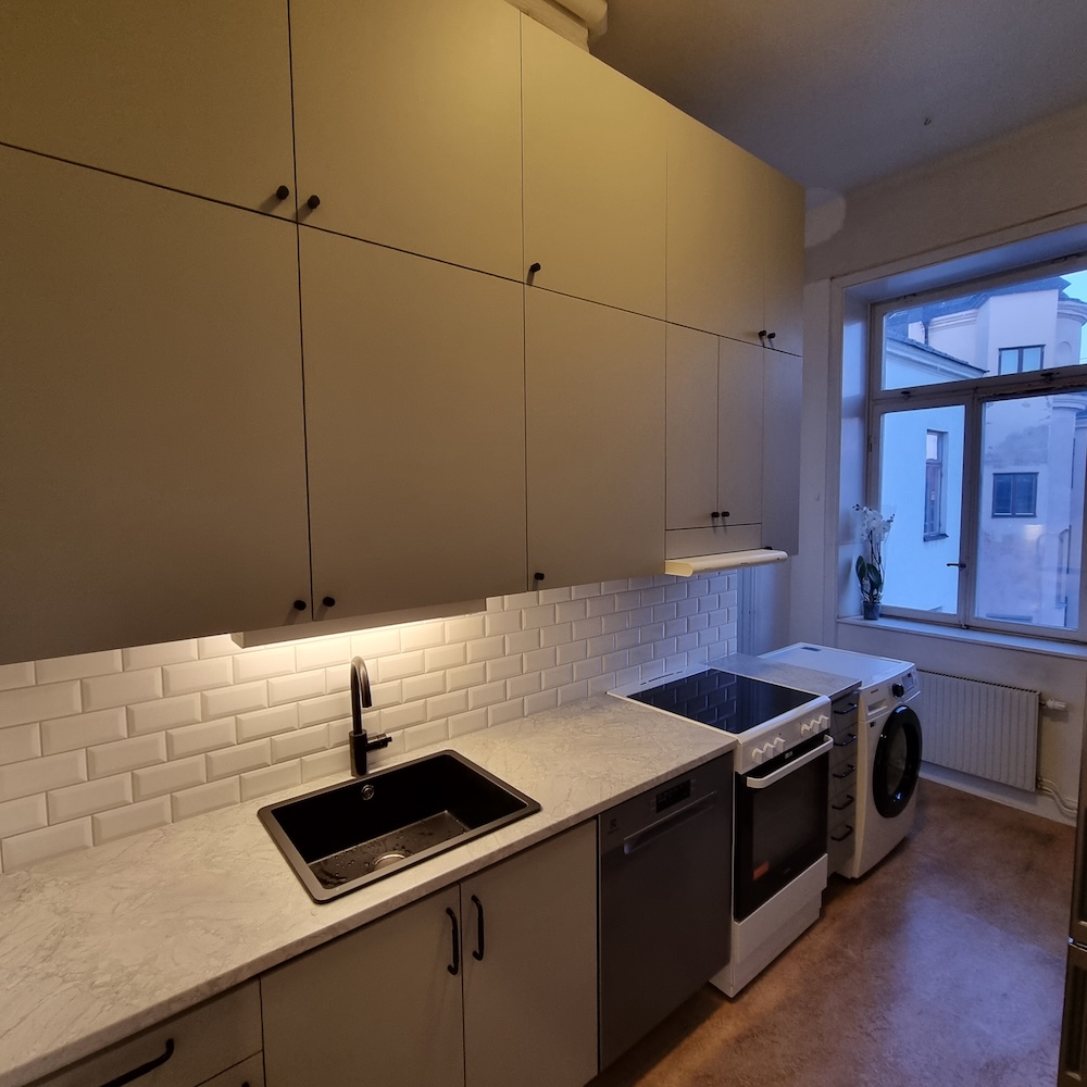 Köket fick nya material och ytskikt, vilket tillsammans med det nymålade rummet gav bostaden ett modernt och fräscht uttryck. Ett noggrant genomfört projekt där målning, snickeriarbete och planering samverkade för att lyfta hela hemmet. En nöjd kund som uppskattade både resultatet och den smidiga processen.