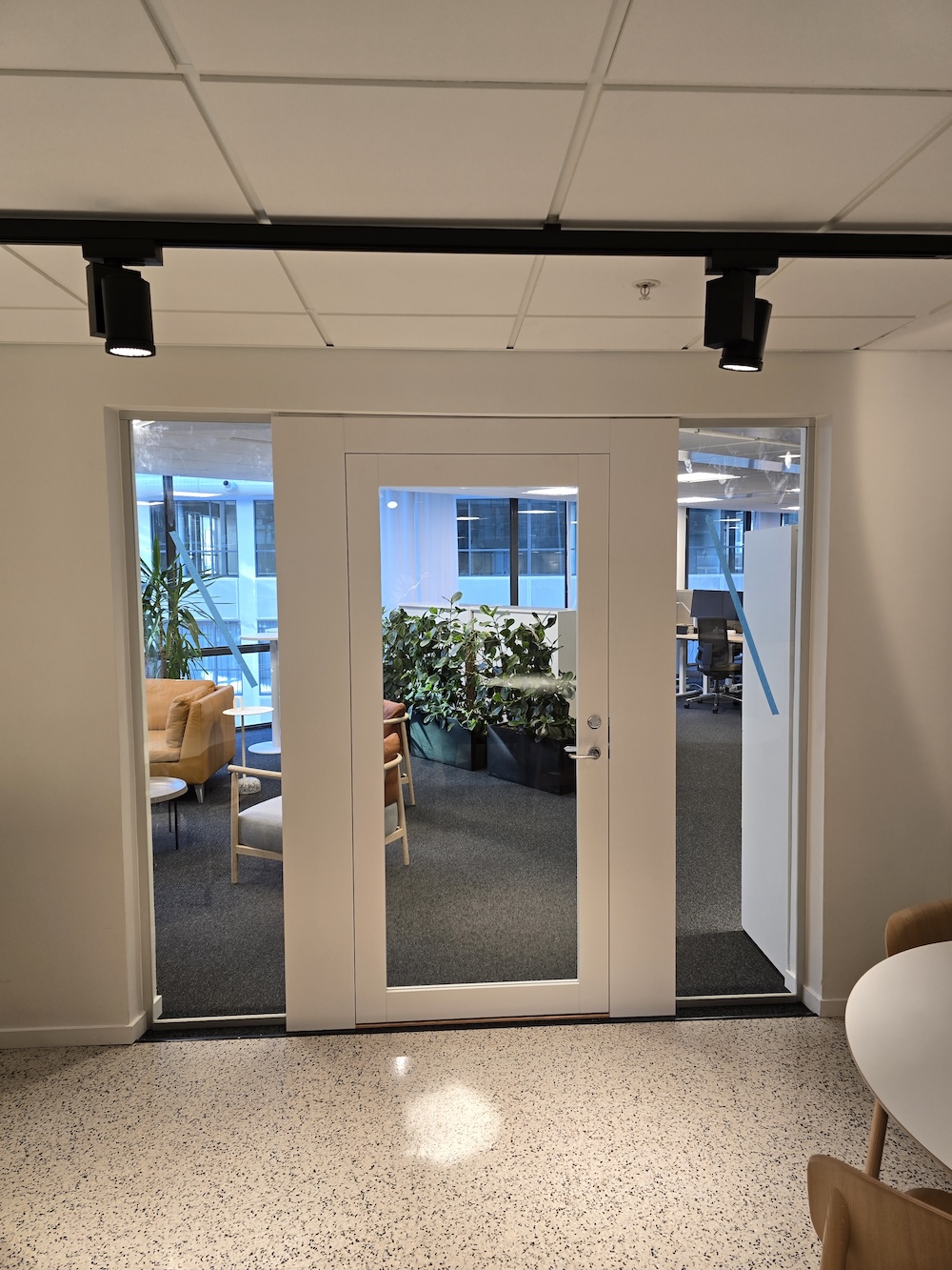 I det här projektet fick vi uppdraget att anpassa en kontorslokal efter kundens nya behov. Vi byggde tre nya mötesrum och avdelade lokalen med en dörrportal och glaspartier mot pentryt och den övriga kontorsytan – för att skapa en öppen men tydligt strukturerad miljö.