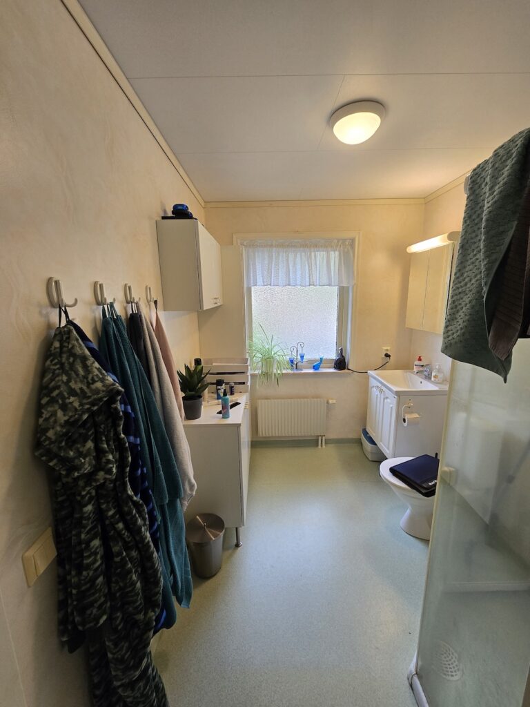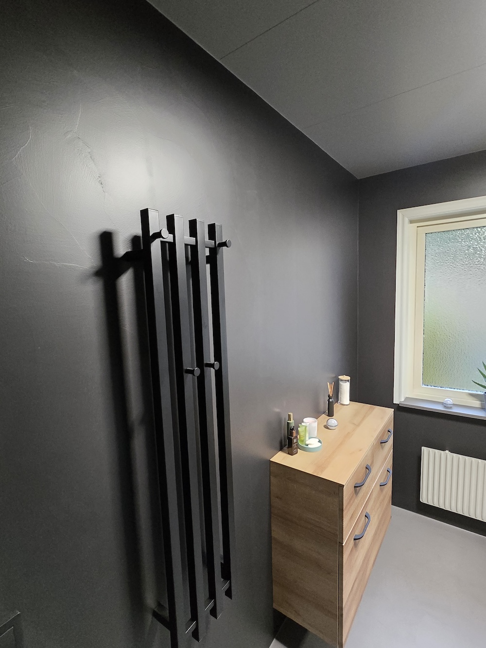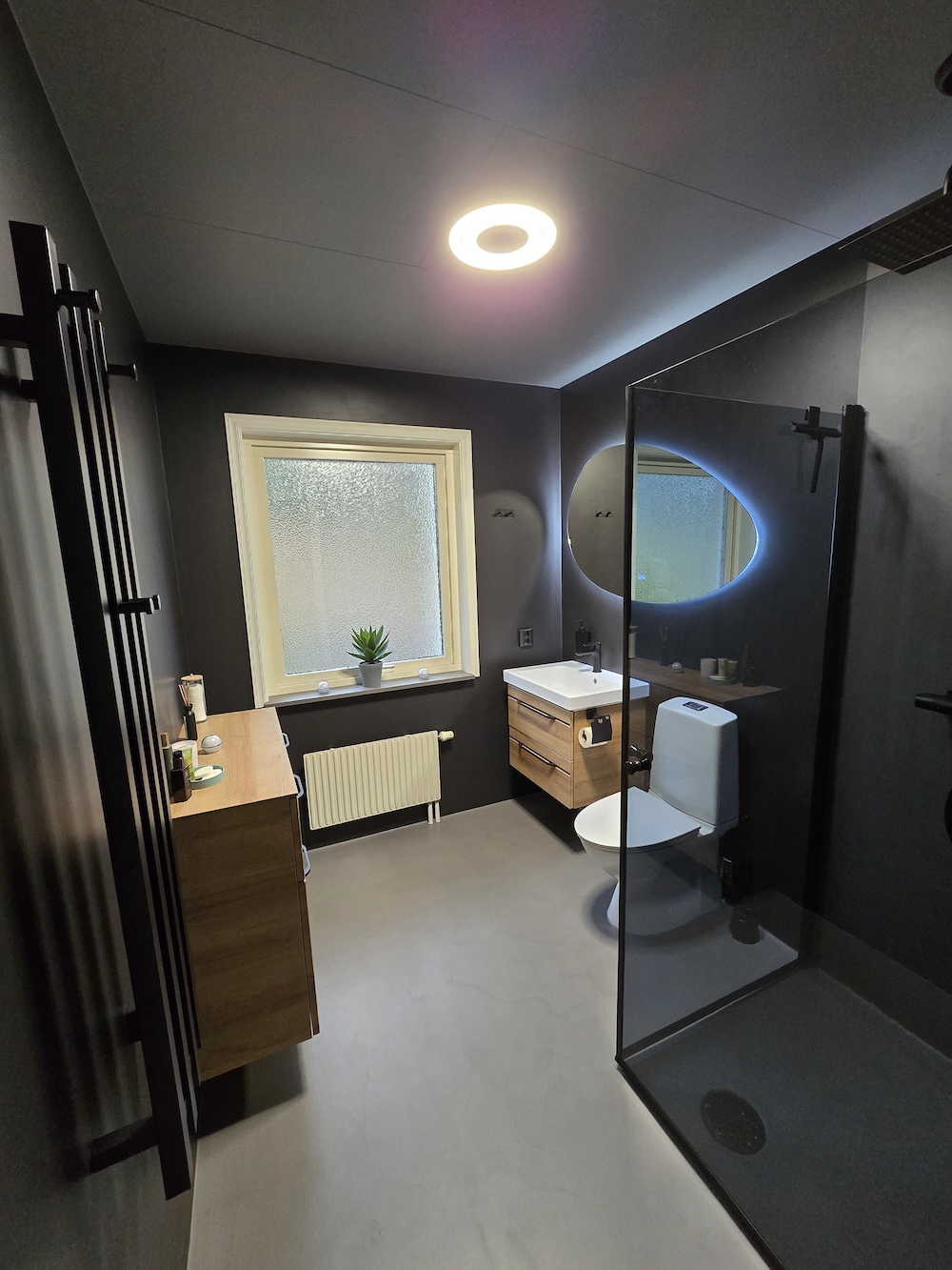 De svarta väggarna tillförde djup och kontrast mot de mjukare grå tonerna – en kombination som gav badrummet ett personligt och elegant uttryck.