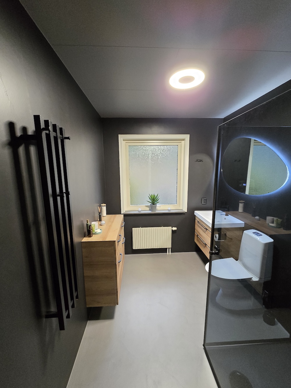 Taket målades i samma grå ton som golvet, och i duschen fick microcementet fortsätta hela vägen upp mot taket för att skapa en sammanhängande och harmonisk helhet.