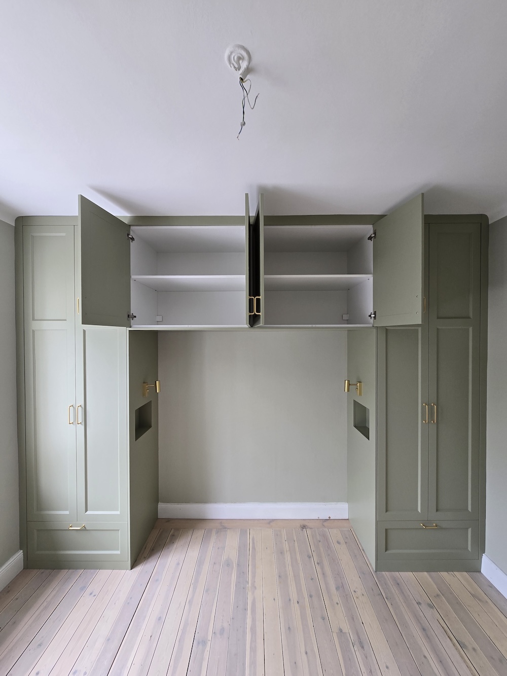 Den största delen av projektet var en platsbyggd garderob runt sängen – med integrerade nischer, eluttag och belysning. En skräddarsydd lösning som kombinerar funktion och design på ett sätt som gör rummet både praktiskt och unikt.