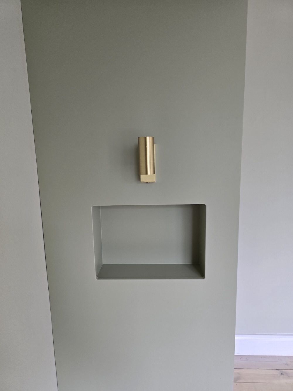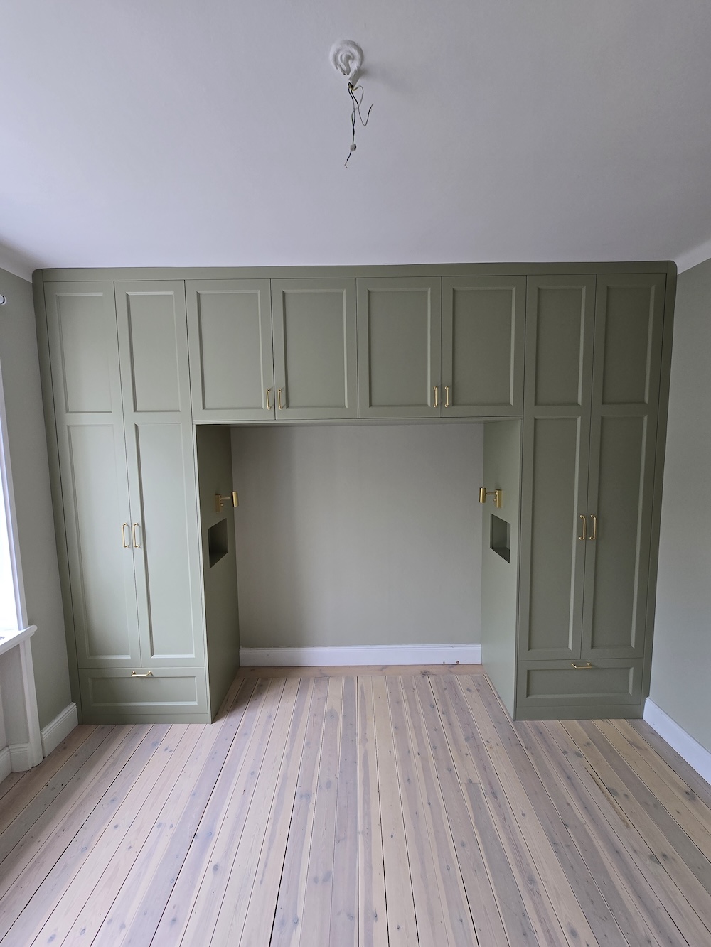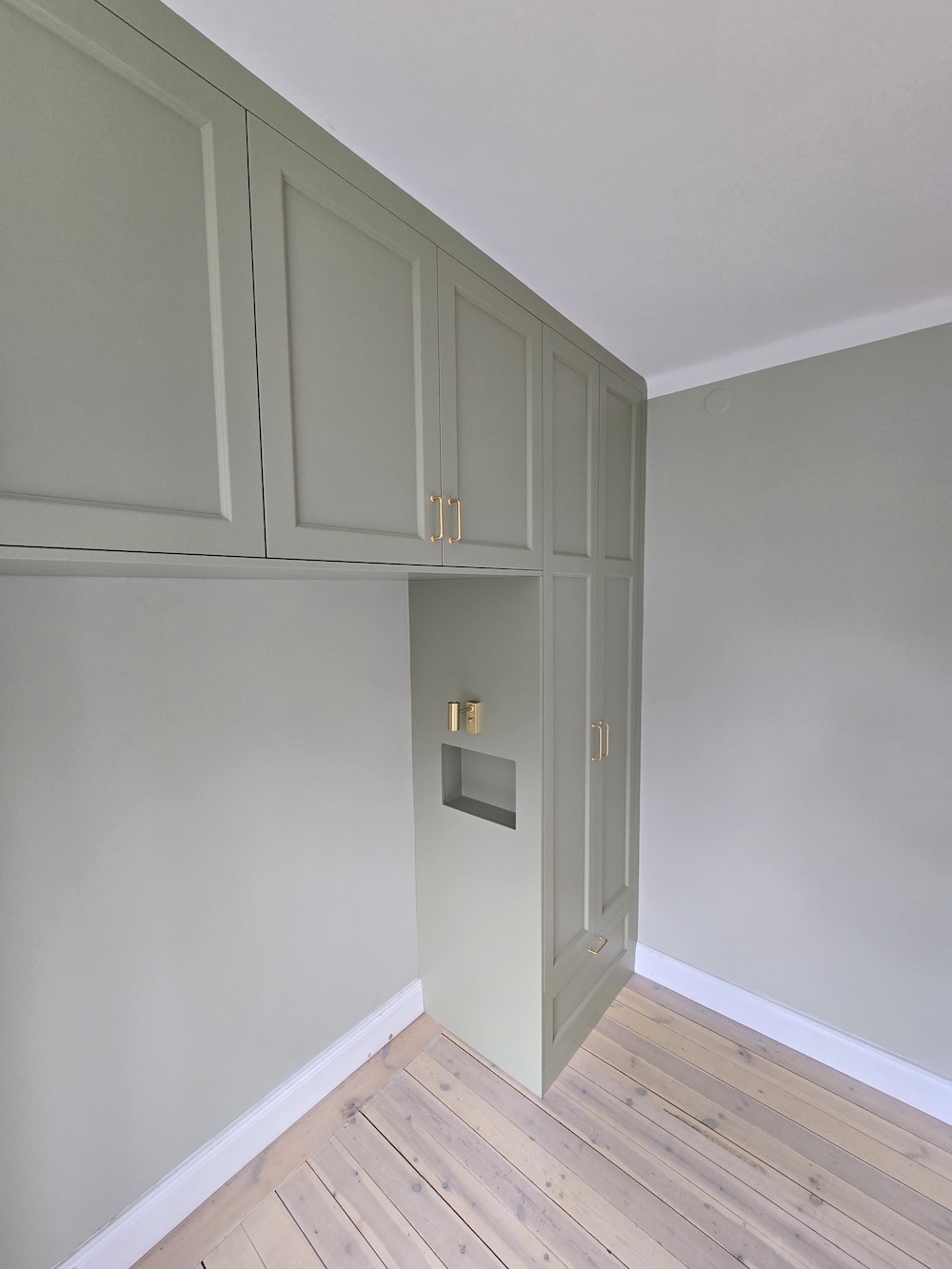 I det här projektet har vi hjälpt kunden att förnya hela lägenheten genom både målning och platsbyggt snickeri. Väggarna målades i gröna nyanser, noggrant utvalda för att skapa en lugn men levande känsla i hemmet. Badrumstaket målades i grått för att ge rummet en mer harmonisk och sammanhållen ton.