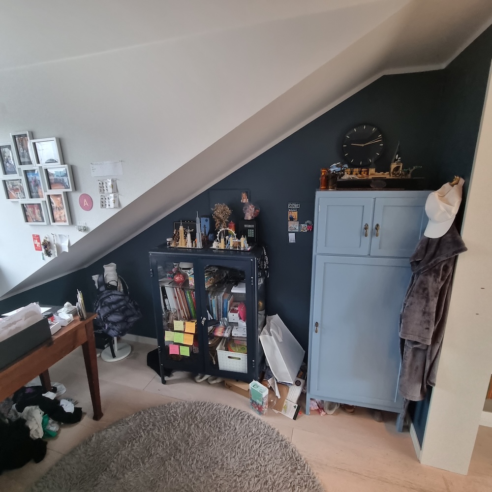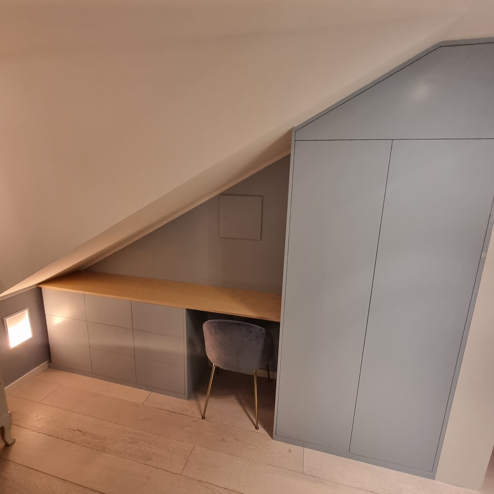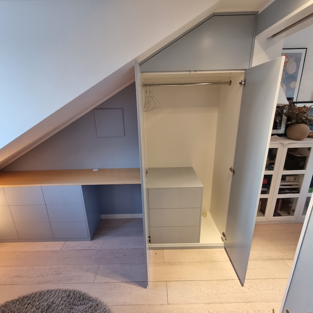 Rummet hade snedtak, vilket gjorde planeringen extra utmanande, men också gav möjlighet att skapa något unikt. Garderoben och luckorna lackerades i en vacker blågrå kulör, samma ton som väggarna vi målade i rummet – vilket skapade en lugn och harmonisk helhet. Skrivdelen fick en bänkskiva i ljus träton, som bröt av fint mot de blågrå ytorna och gav rummet värme och balans.